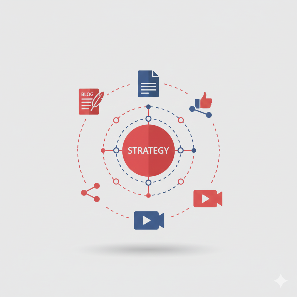 Content calendars, blog posts, social media updates, videos, and infographics are created to maintain a consistent digital presence. Strategy involves audience research, messaging, distribution planning, and performance analysis.